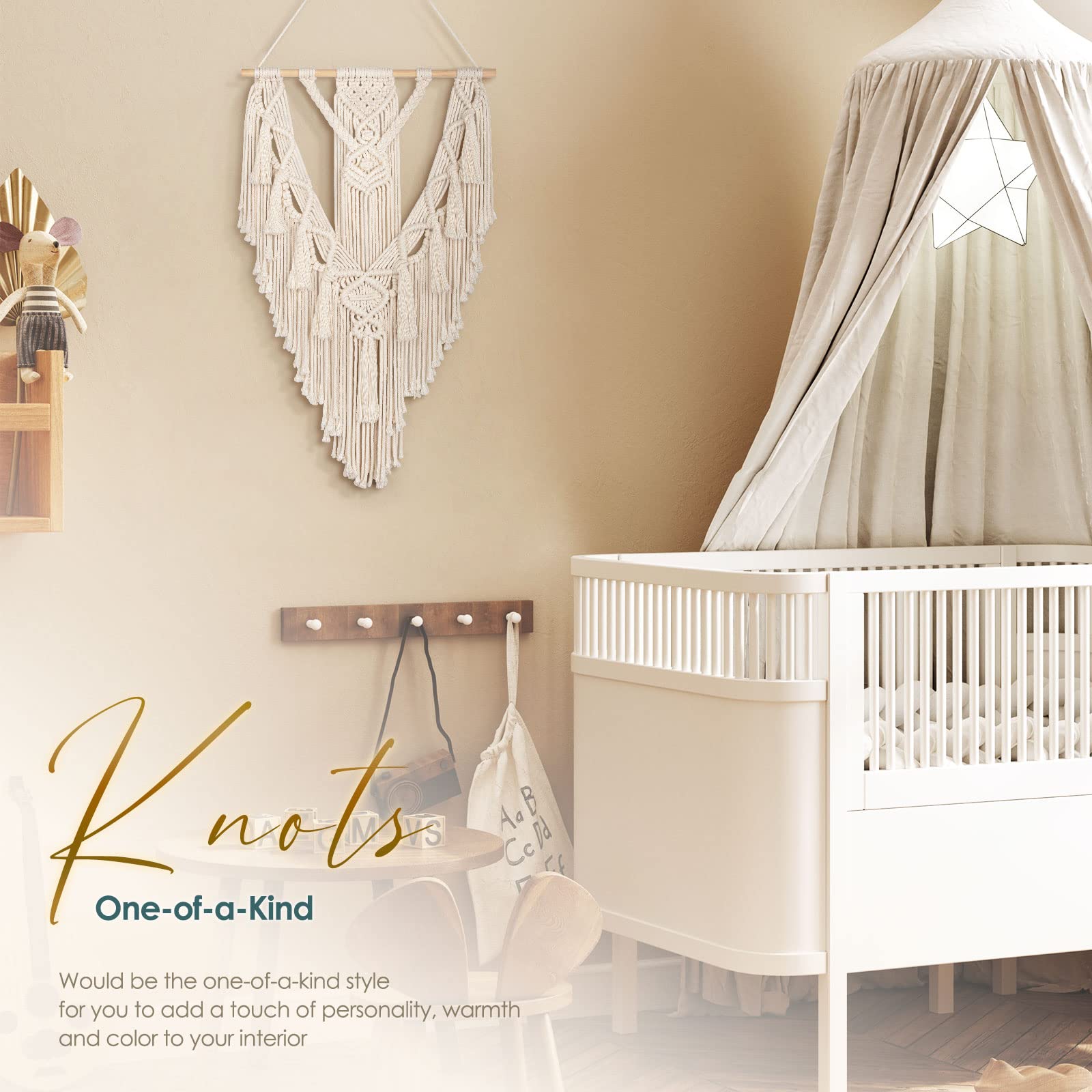 - HOME DECORATION: This beautiful wall hanging macrame will fill a blank wall and give the room a bohemian flair. It will looks gorgeous in a bedroom, sitting room, baby nursery, balcony, studio or in your living room as a stylish and cozy decor. You can hang it anywhere: above the sofa, fireplace, desk or on the top of your bed. even a cozy cafe or a studio. With warm, natural colors, making your home feel even homier.