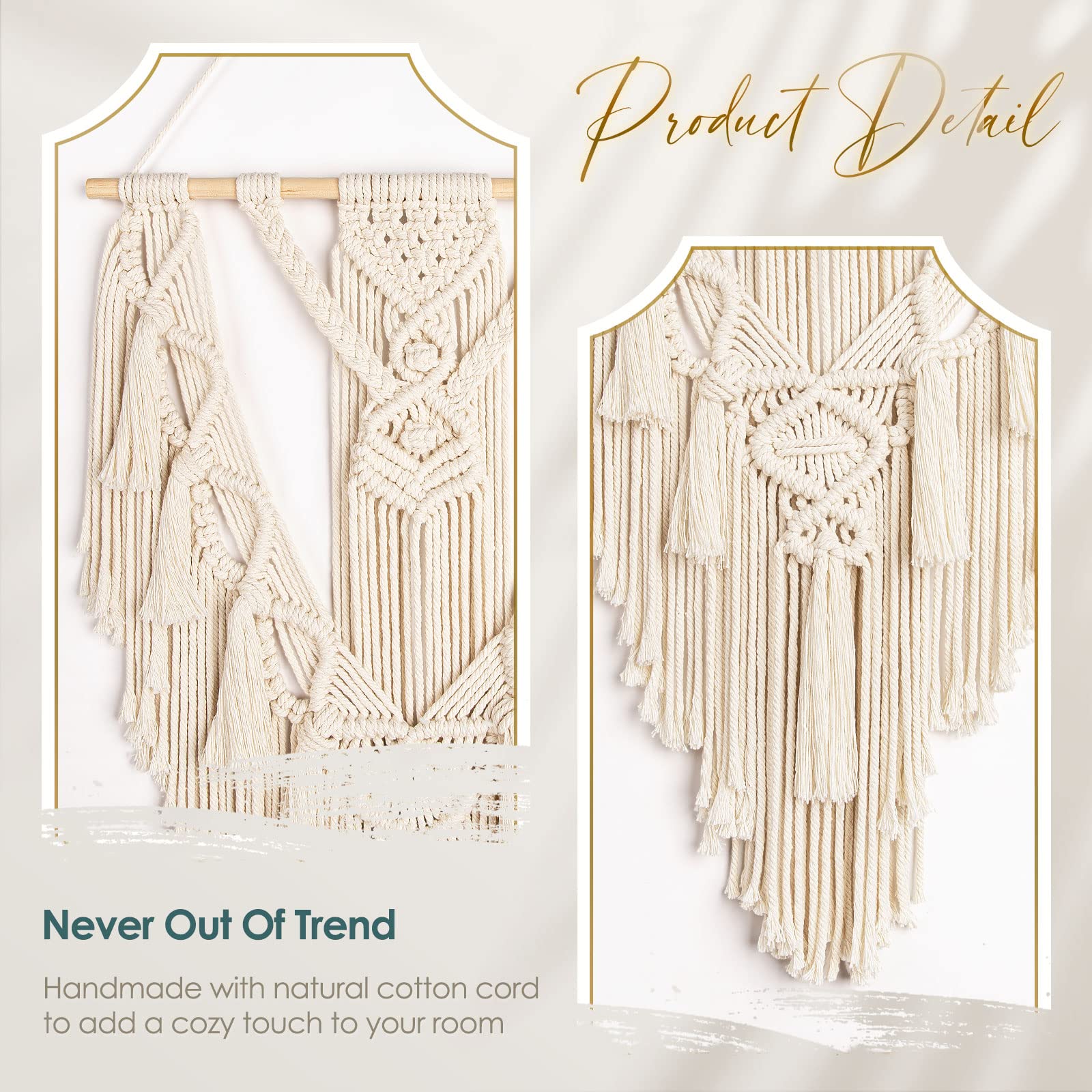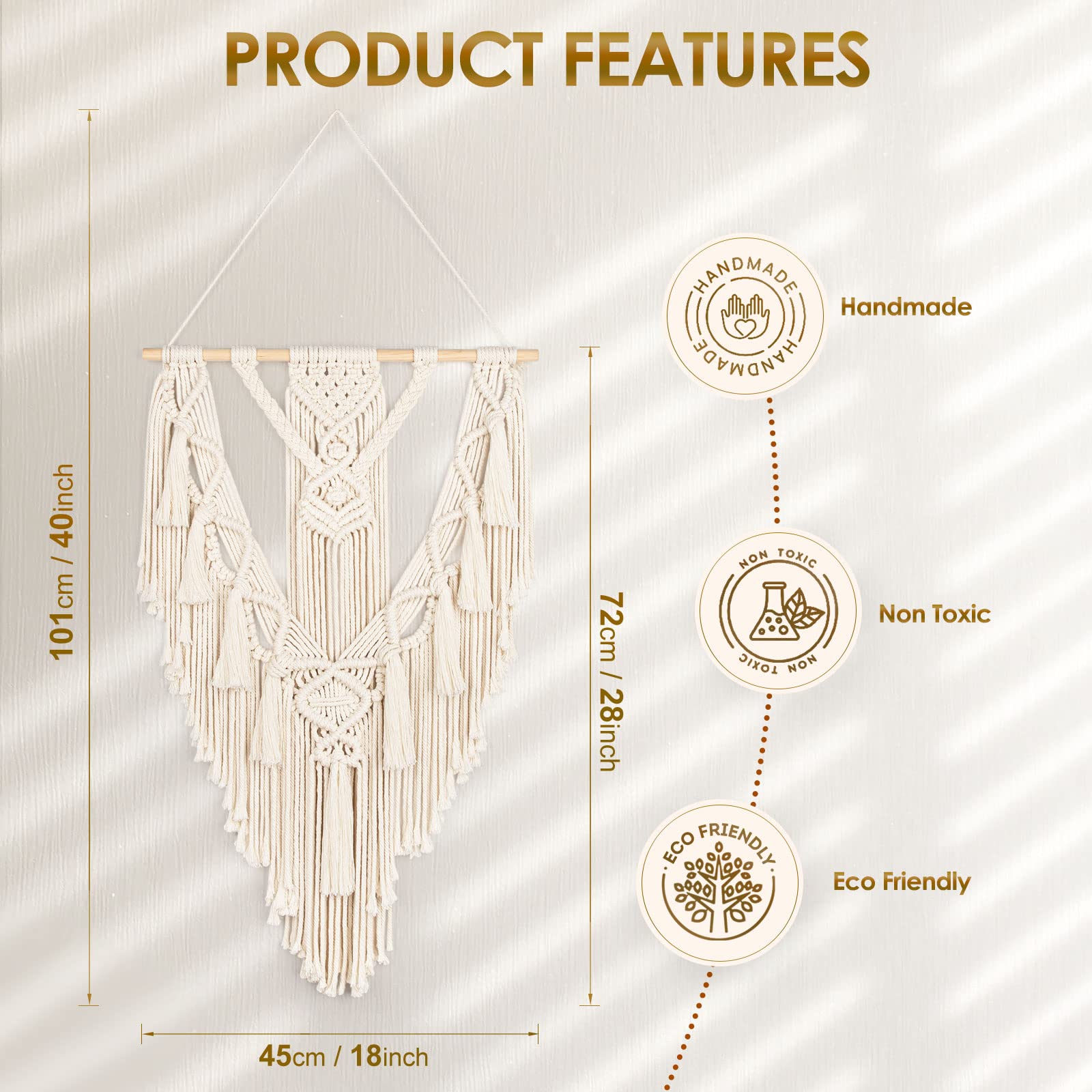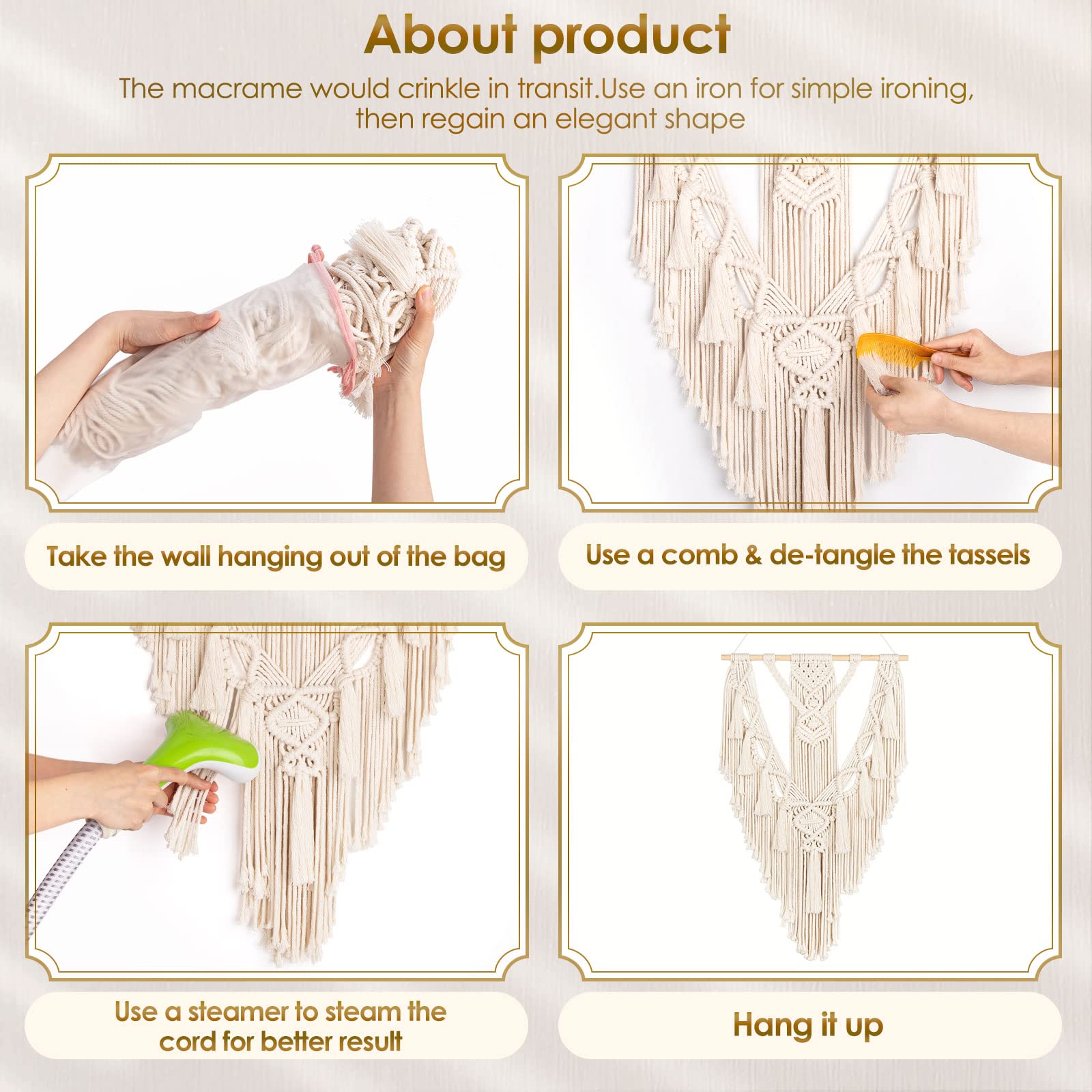 - ECO-FRIENDLY: This macrame wall hanging is made of pure cotton cord, without artificial ingredients or chemicals. We believes using natural materials will bring a feeling of safety and a feeling of connection to Earth. This macrame art pieces was inspired by our designer’s interest in the native american culture, its patterns and symbolism.