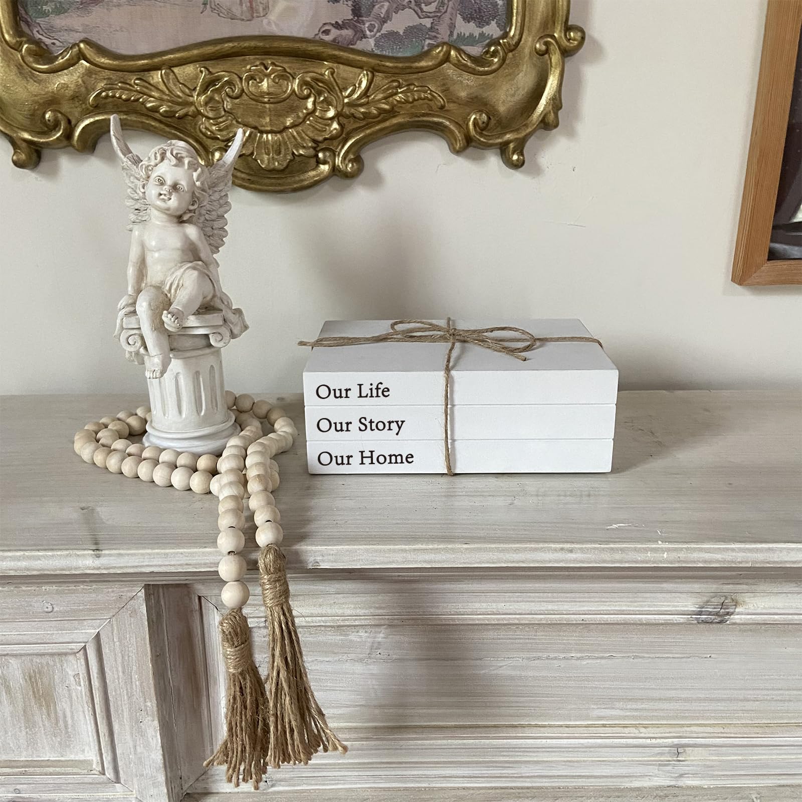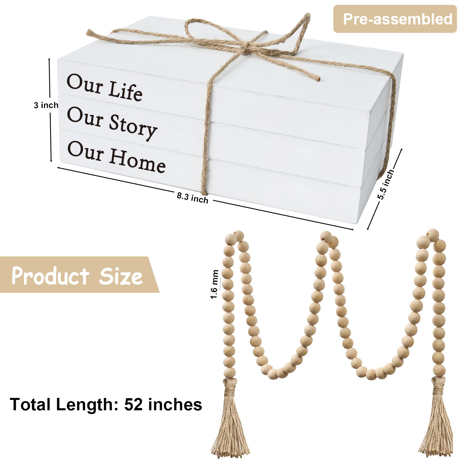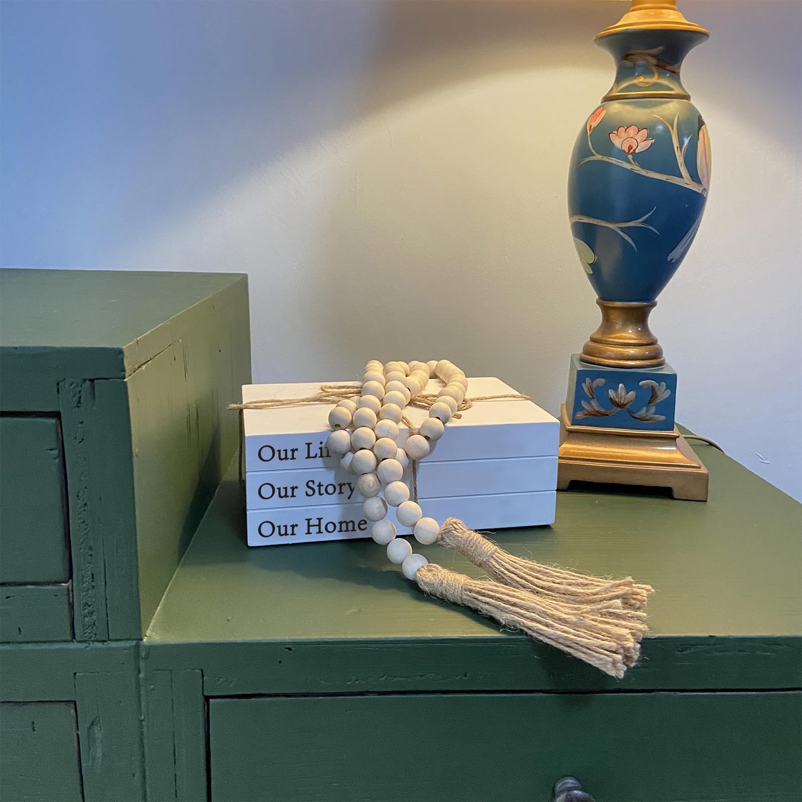 - What You’ll Receive: a set of decorative white books that say “Our Life Our Story Our Home”. The set also includes a farmhouse bead garland with tassels, creating a stylish look for your bookshelf, nightstand, coffee table and fireplace.