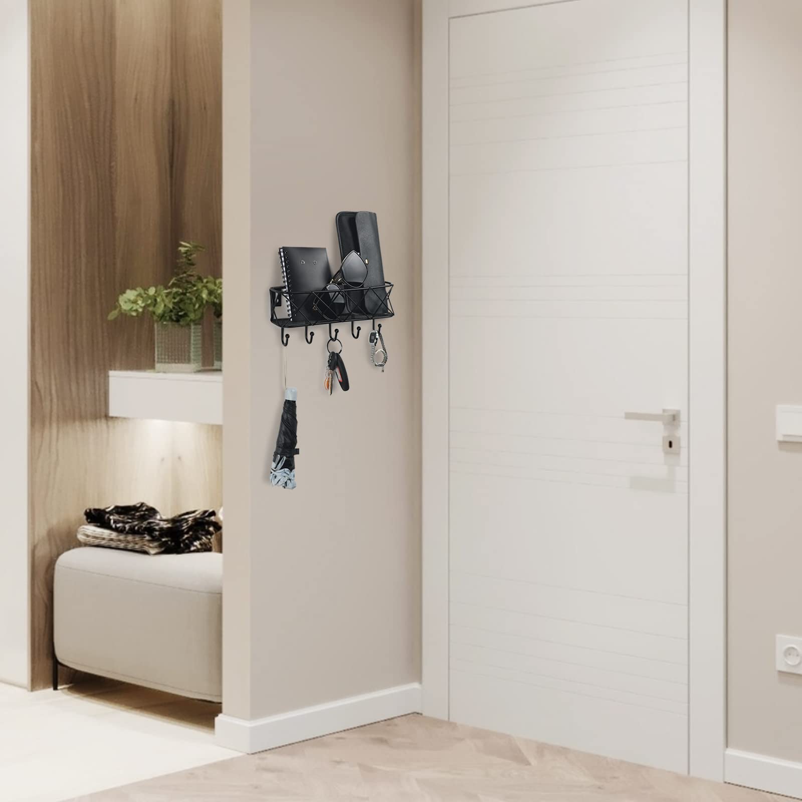 - 【Multi-Function Keys Holder】Wall key holder for hanging keys, dog leash/collars/harnesses, masks, hats, umbrellas, headphones, lanyards with work Id,and entryway shelf basket for putting wallet, sunglasses,mail, letter,receipts,magazines. Could hold about 1 wallet,1 sunglasses and several mails in the top basket.Mail and key holder for wall help to clear up countertop space.