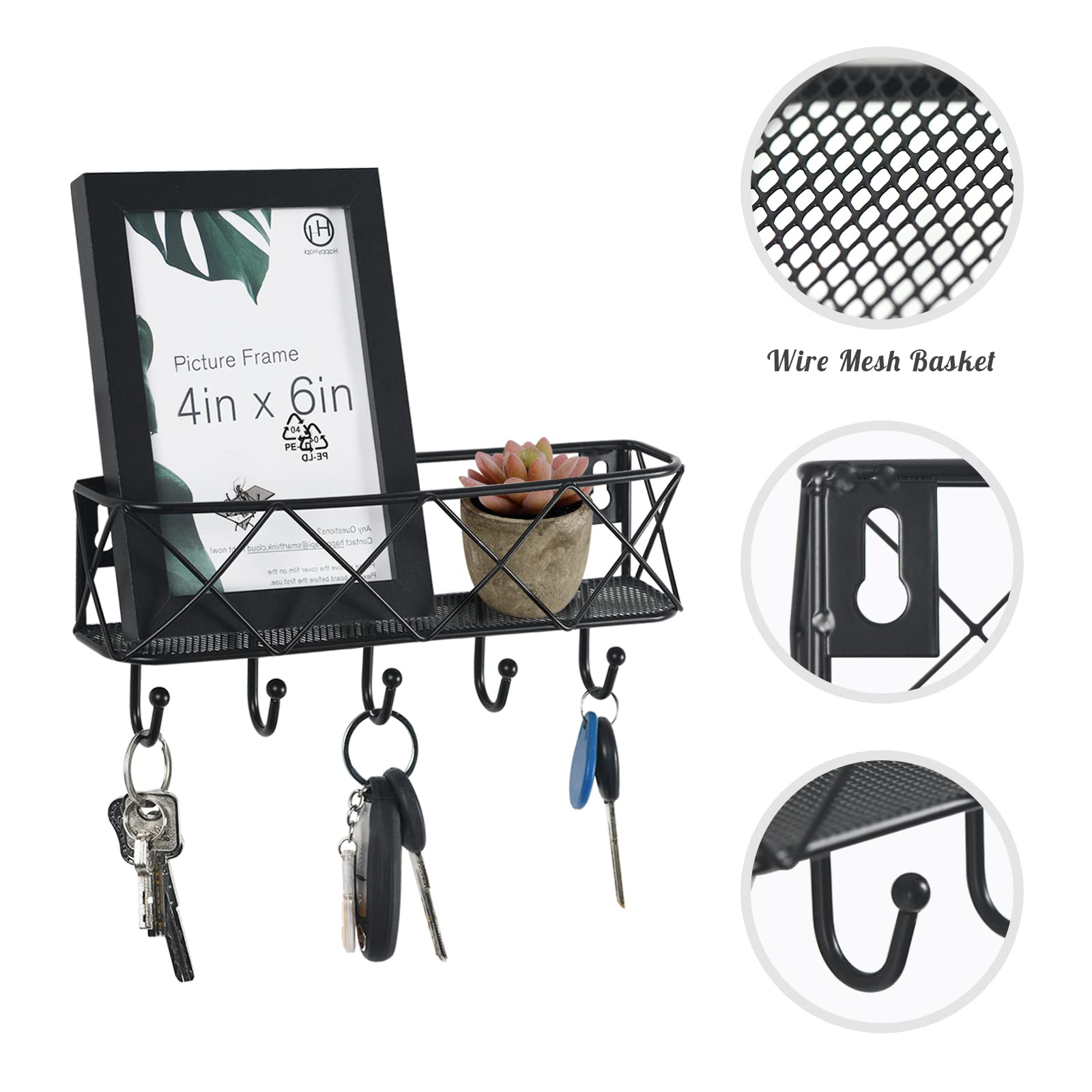 HappyHapi Key Holder for Wall Decorative, Entryway Key Hooks, Wall Mounted Key Rack with 5 Hooks, Metal Wire Mesh Basket Mail Holder, 9.8”Lx2.1”Wx4.1”H