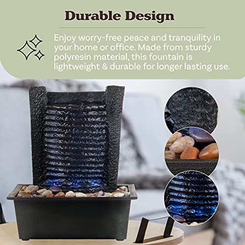- DURABLE DESIGN – Made from tough polyresin material, this tabletop water fountain is lightweight and sturdy for longer lasting use. The included river rocks add a natural touch while efficient LED lights illuminate the water and offer a peaceful glow.