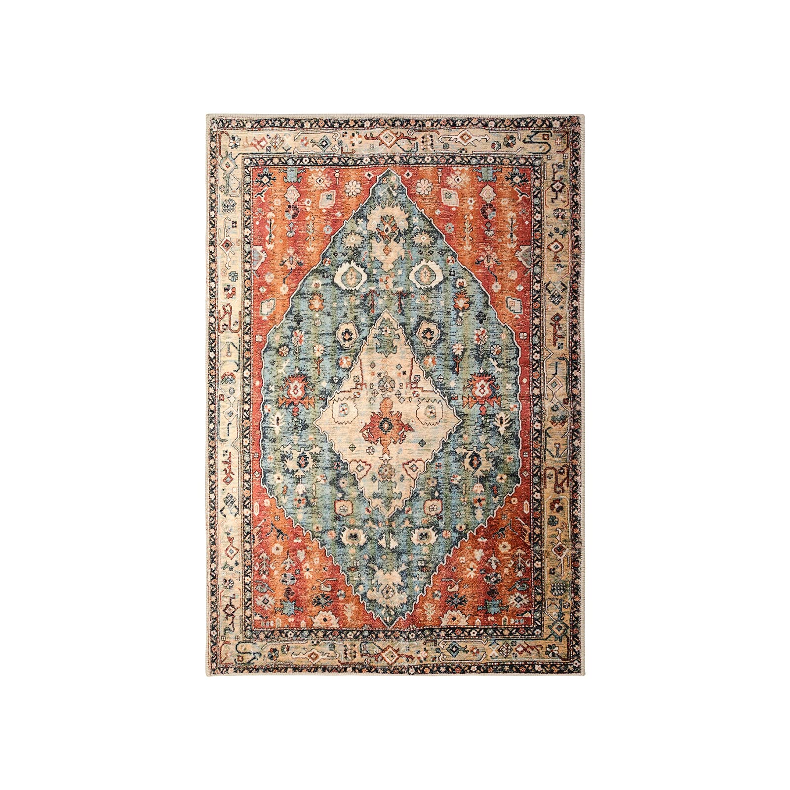 - [Exclusive Design Oriental Rug] – This boho chic kitchen rug offers intricate printed texture on a soft-underfoot polyester base.The teal blue classic diamond center and red and cream border come alive with tribal element. Red distressed rug would effortlessly complement any decor and most contemporary living spaces.
