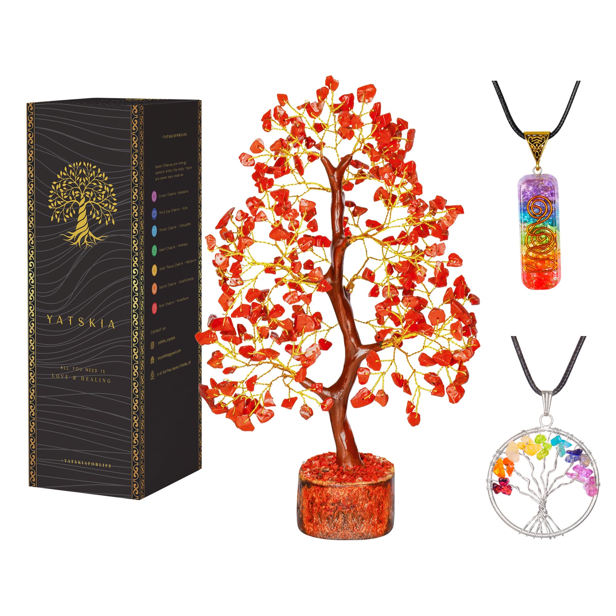- Red jasper crystal tree of life – With firm packaging, the box includes an astonishing red jasper crystal tree and a pair of seven chakra healing pendant necklaces (pair includes seven chakra tree of life necklace & seven chakra orgone pendant). As the branches and the trunk of this Buddhist figurine are flexible, the gemstone money tree comes folded due to packaging reasons. You need to unravel the crystal tree upon receiving.