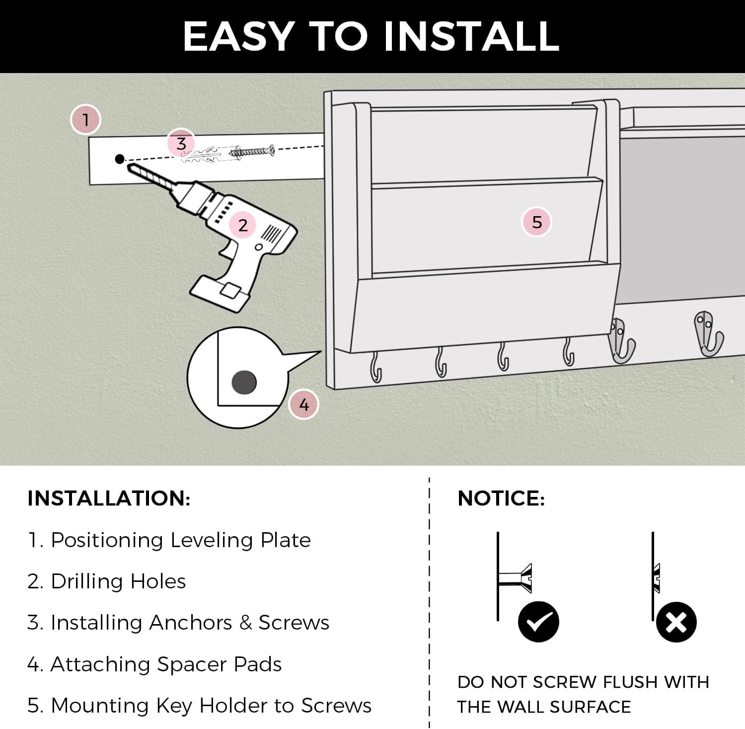- Sturdy Hooks & Easy To Install: The 3 tough hooks are super sturdy to hold up to 22 LBS. With the leveling tool and mount hardware, you can easily install the key shelf in 10 mins without leaving unnecessary holes in the wall. No need to call a handyman!